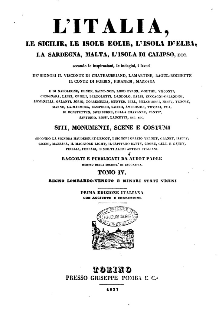 DE ‘ SIGNORI IL VISCONTE DI CHATEAUBRIAND , LAMARTINE , RAOUL – ROCHETTE IL CONTE DI FORBIN , PIRANESI , MAZZARA E DI NAPOLEONE , DENON , SAINT – NON , LORD BYRON , GOETHE , VISCONTI , CICOGNARA , LANZI , ORIOLI , BERTOLOTTI , DANDOLO , BALBI , ZUCCAGNI – ORLANDINI , ROMANELLI , GALANTI , JORIO , TORREMUZZA , MUNTER , BELL , MELCHIORRI , NIBBY , TENORE , MANNO , LA – MARMORA , RAMPOLDI , SACCHI , AMBROSOLI , TICOZZI , FEA , DI BONSTETTEN , SWINBURNE , DELLA CHAVANNE , CANTU ‘ , SARTORIO , ROSSI , LANCETTI , ECC . ECC . SITI ,